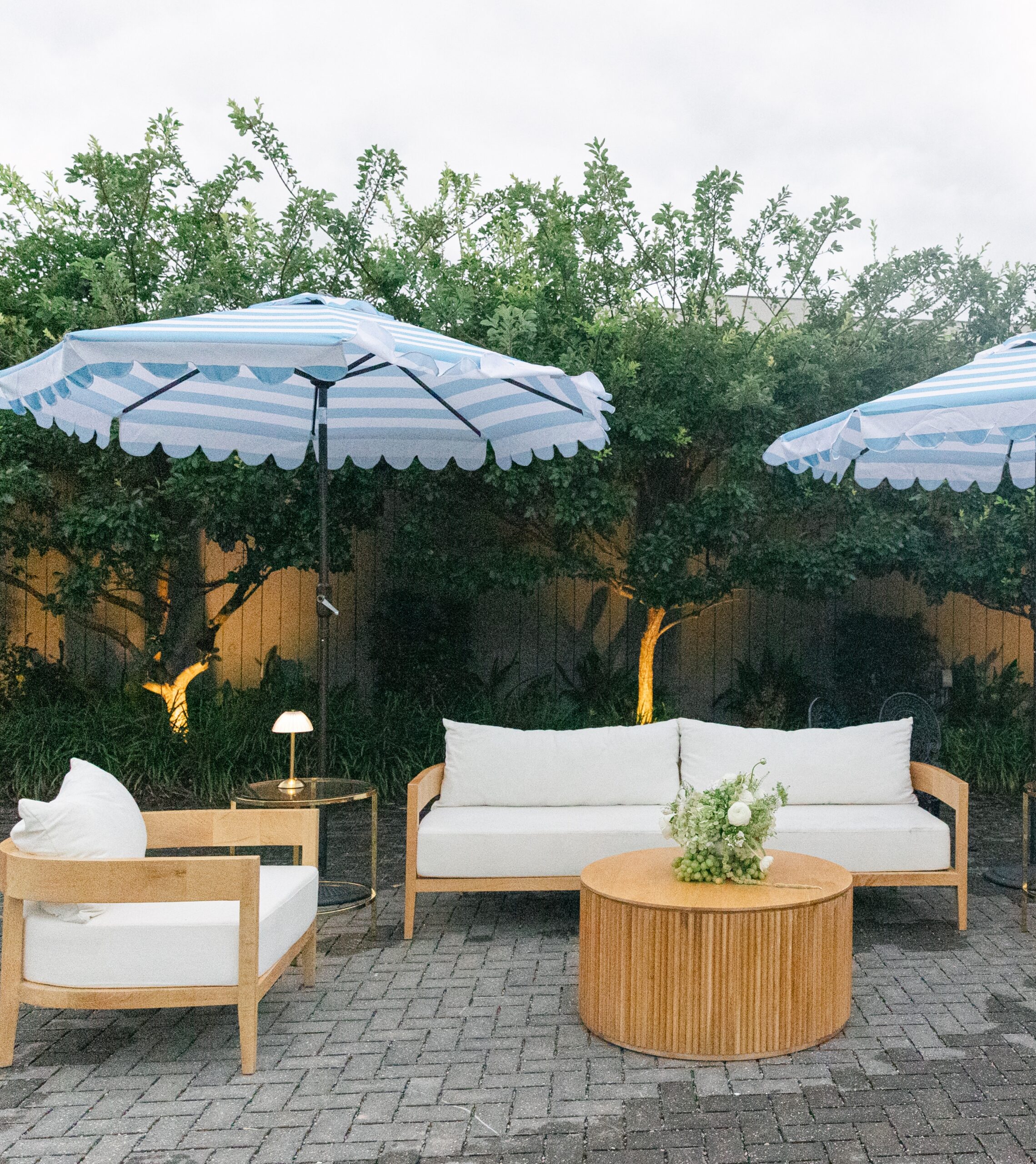 Outdoor gatherings benefit from intentional shade and comfort planning. Market umbrellas provide flexible coverage for dining tables, cocktail areas, and lounge groupings, helping guests stay comfortable during daytime and early evening events.