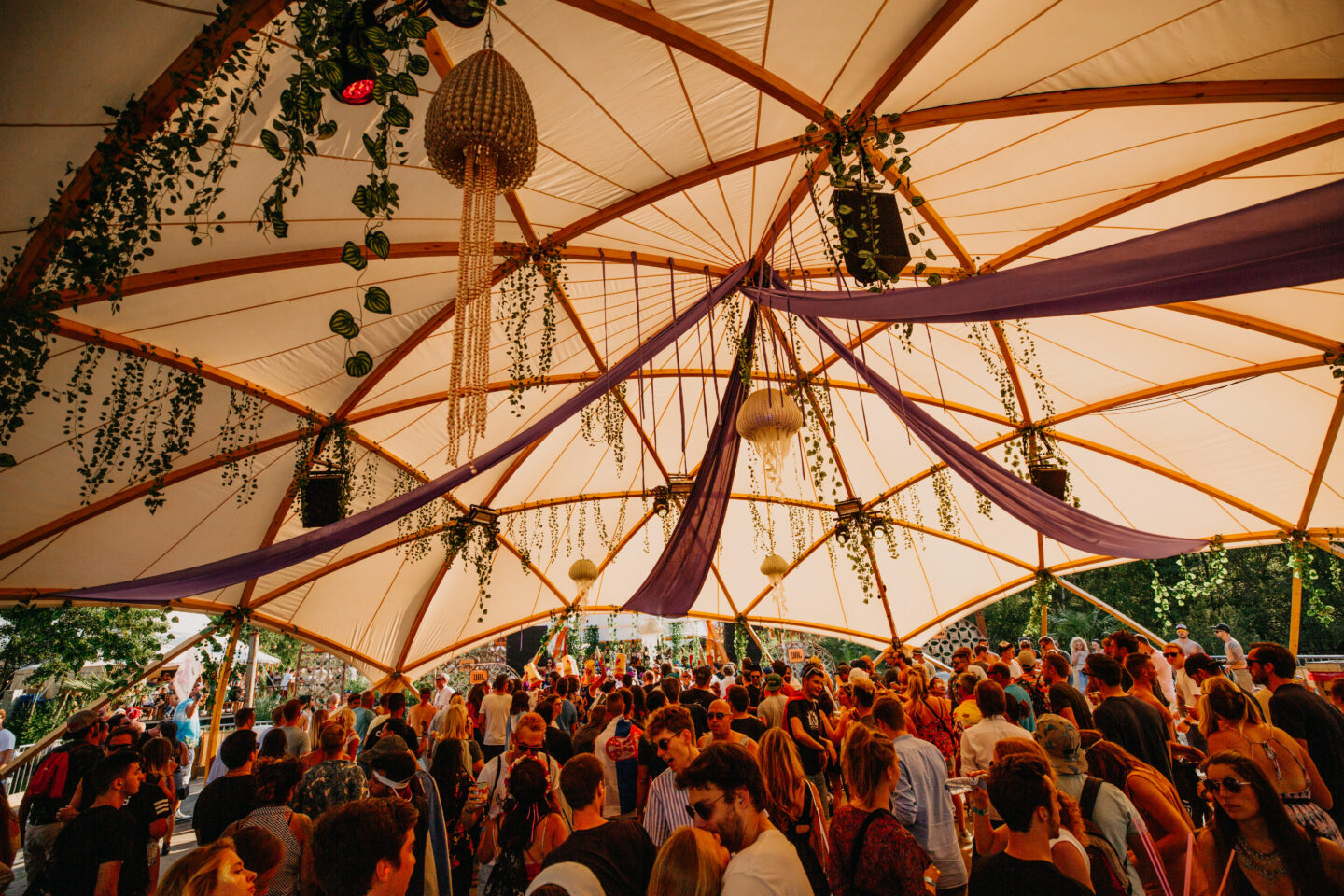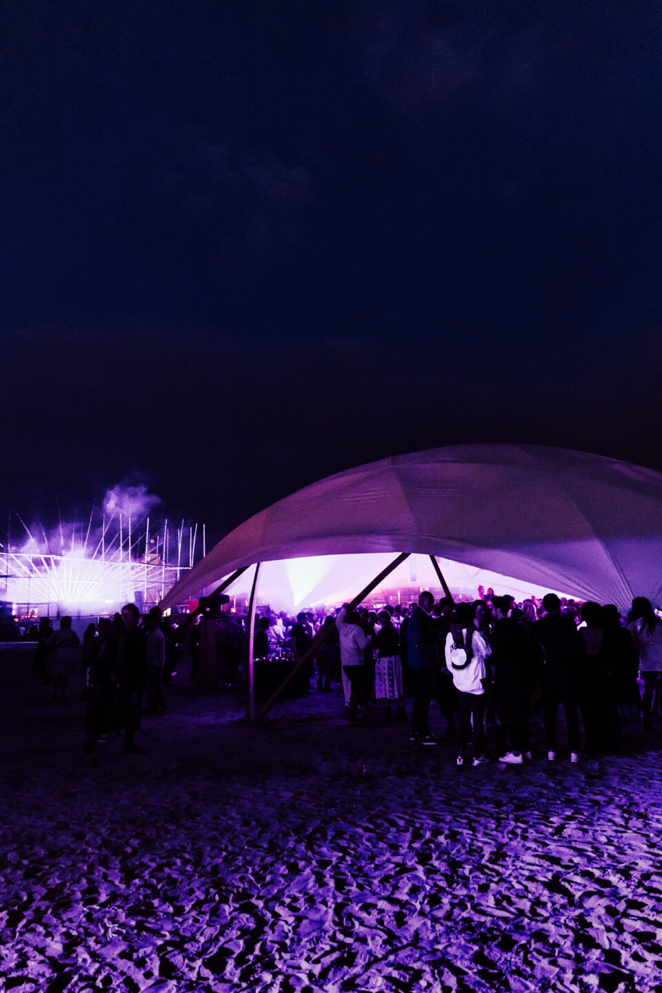 Among large-scale festival energy, the dome stood out as a visual landmark. Its sailcloth canopy glowed from within at night, creating a beacon that drew guests in. The architectural form offered both openness and intimacy, ideal for shared gathering spaces, elevated hospitality, and experiential design.