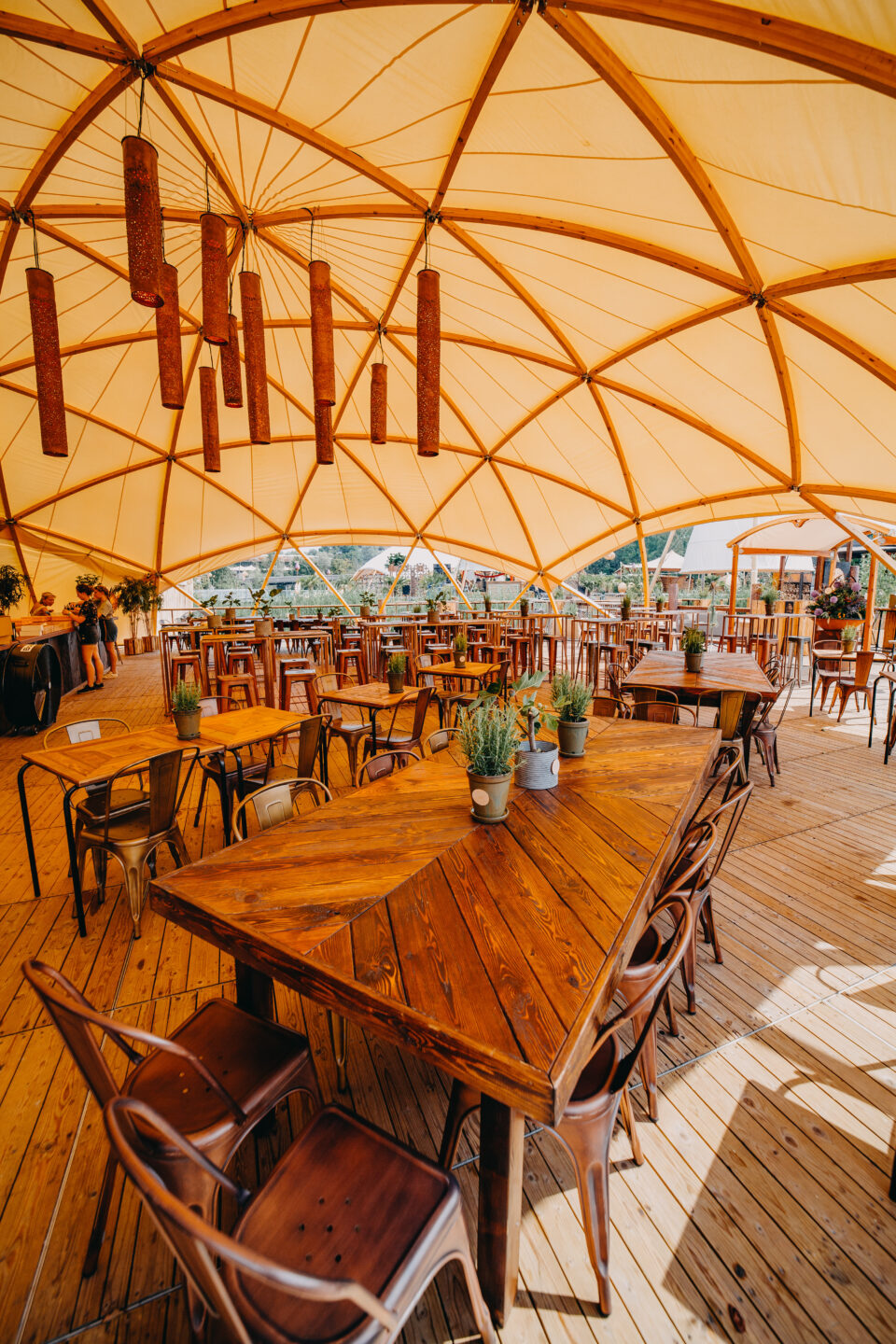 Unlike traditional tents, the OC Wooden Dome is a self-supporting structure, meaning the interior remains open and free of center poles. The curved wooden beams guide the eye upward into a clean, architectural silhouette. Natural daylight filters through the sailcloth by day, illuminating the space with a soft, ambient glow. At night, the dome transforms with lighting—becoming a warm, illuminated landmark within the landscape.